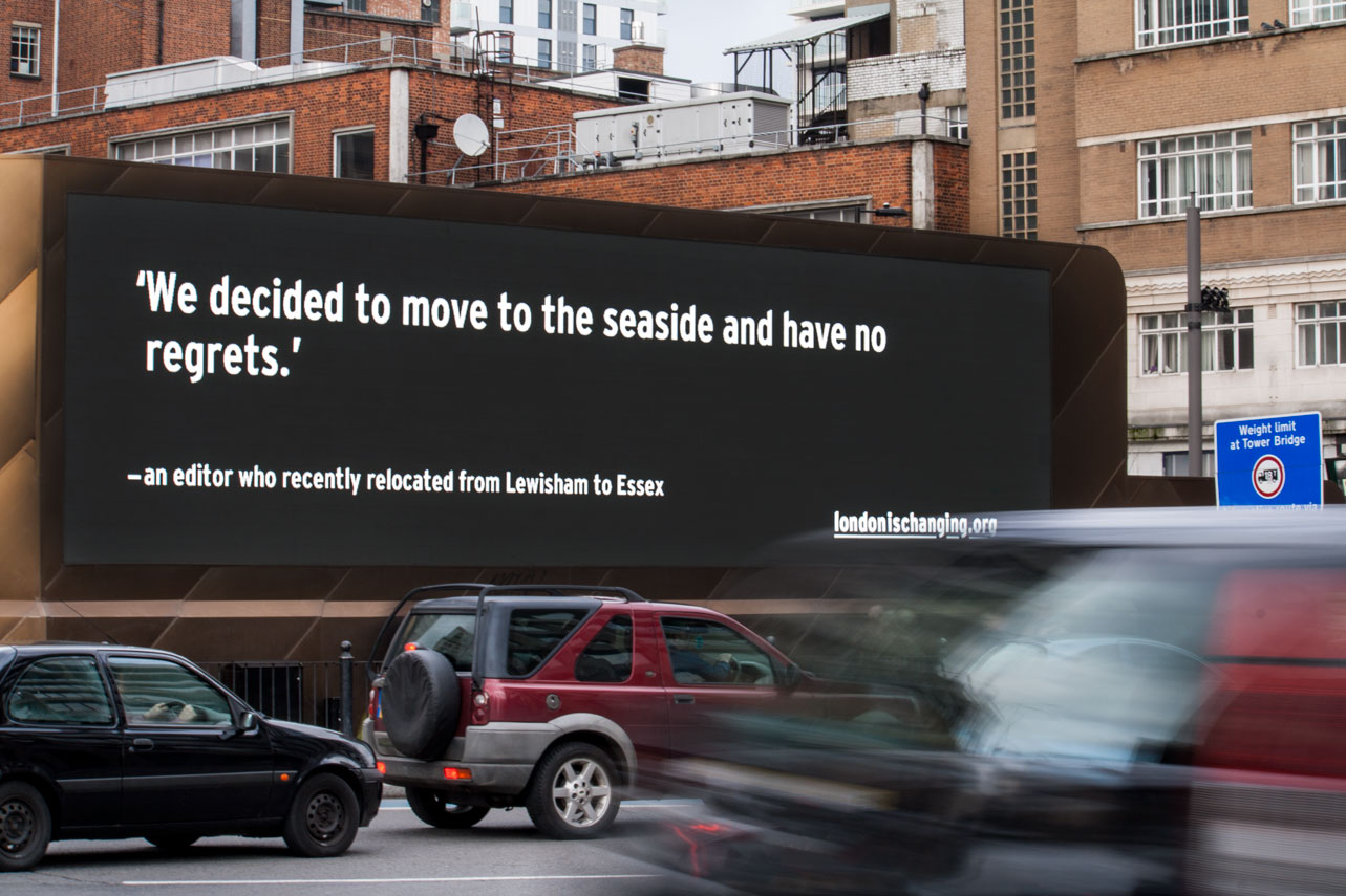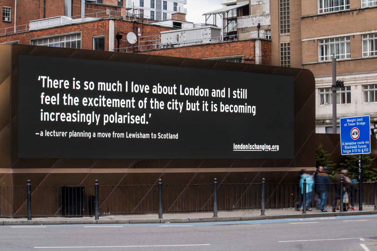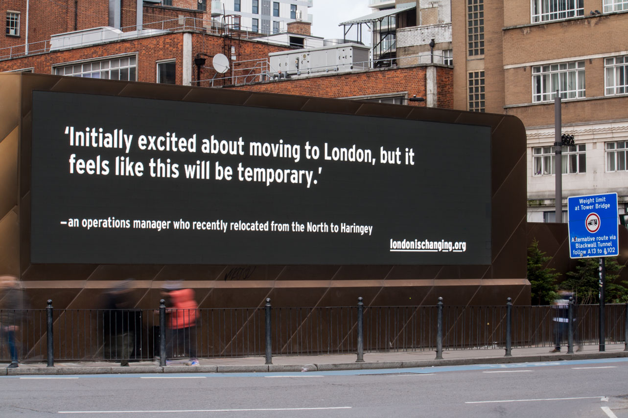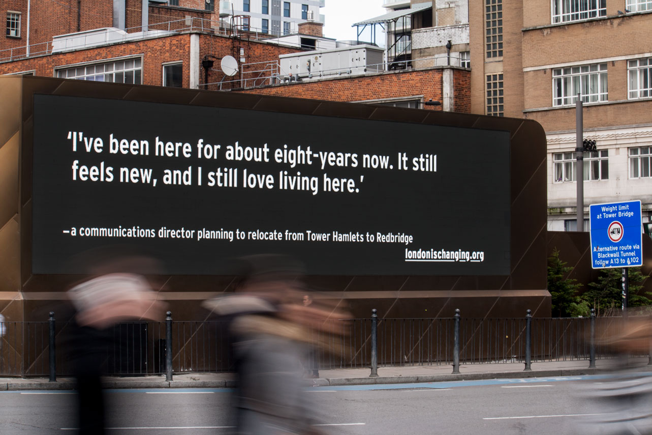 This is the archived site for London is Changing, a project that ran during 2015 which facilitated discussion about the impact of economic and policy changes on the culture and diversity of London. Via a web form, participants were asked a series of questions intended to draw out a personal stories and circumstances that would place large scale demographic into more specific context. An edited selection of responses was displayed on digital billboards in Central London during late February and early March 2015. Over 5,000 participants who recently (within the previous 12 months) or were planning (within the subsequent 12 months) a move to, from, or around Greater London participated. The entire set is available for as a csv file under a CC0 'No Rights Reserved' basis. Please note that the web form was structured so that questions could be answered without any identifiable personal details and we have no way of contacting or following up with participants.