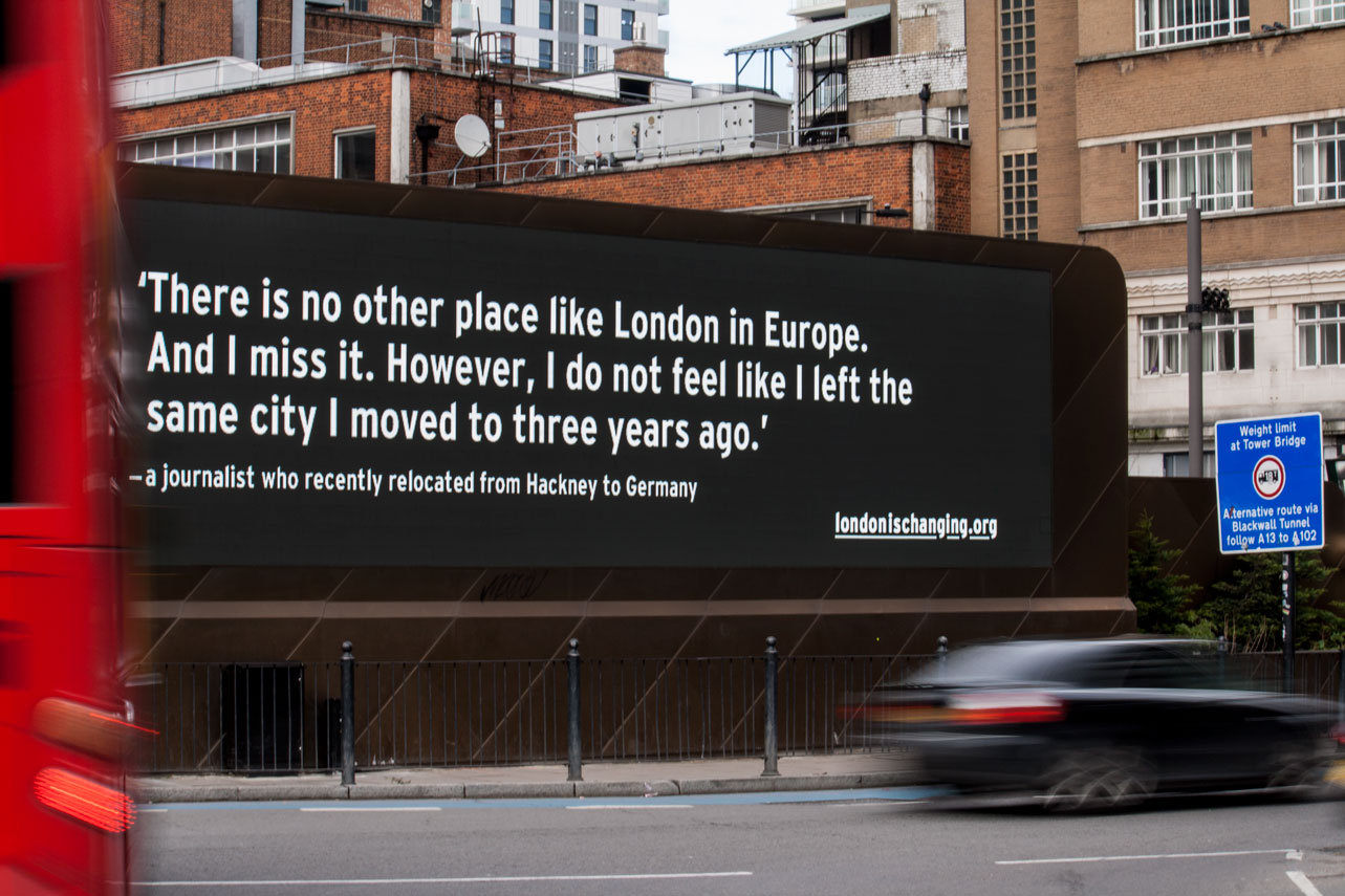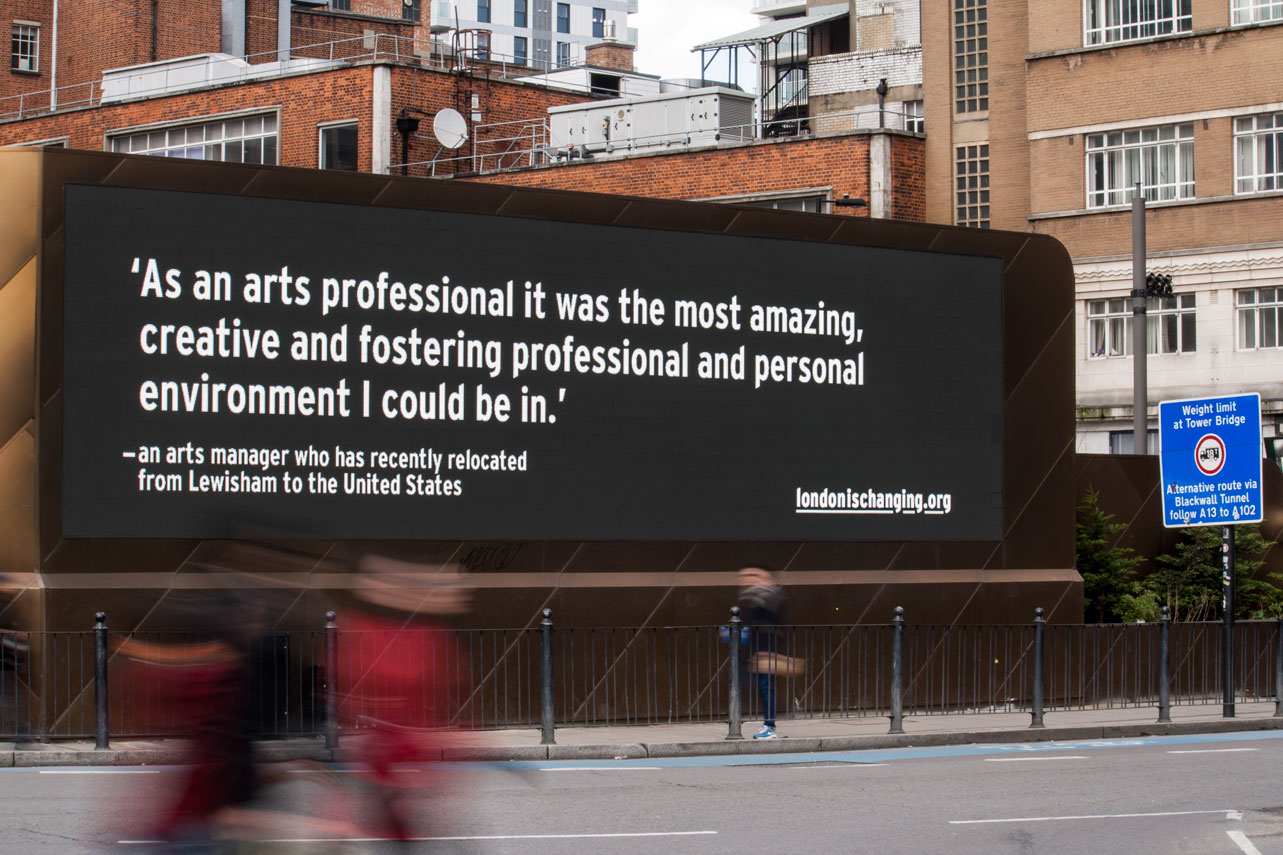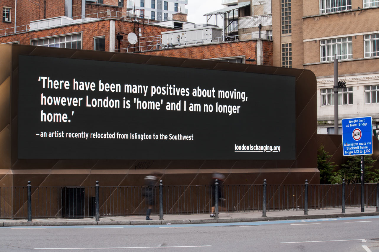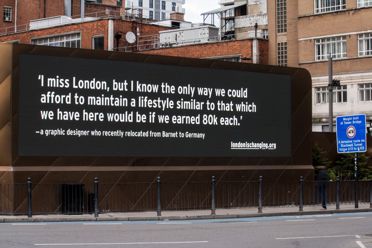 This is the archived site for London is Changing, a project that ran during 2015 which facilitated discussion about the impact of economic and policy changes on the culture and diversity of London. Via a web form, participants were asked a series of questions intended to draw out a personal stories and circumstances that would place large scale demographic into more specific context. An edited selection of responses was displayed on digital billboards in Central London during late February and early March 2015. Over 5,000 participants who recently (within the previous 12 months) or were planning (within the subsequent 12 months) a move to, from, or around Greater London participated. The entire set is available for as a csv file under a CC0 'No Rights Reserved' basis. Please note that the web form was structured so that questions could be answered without any identifiable personal details and we have no way of contacting or following up with participants.