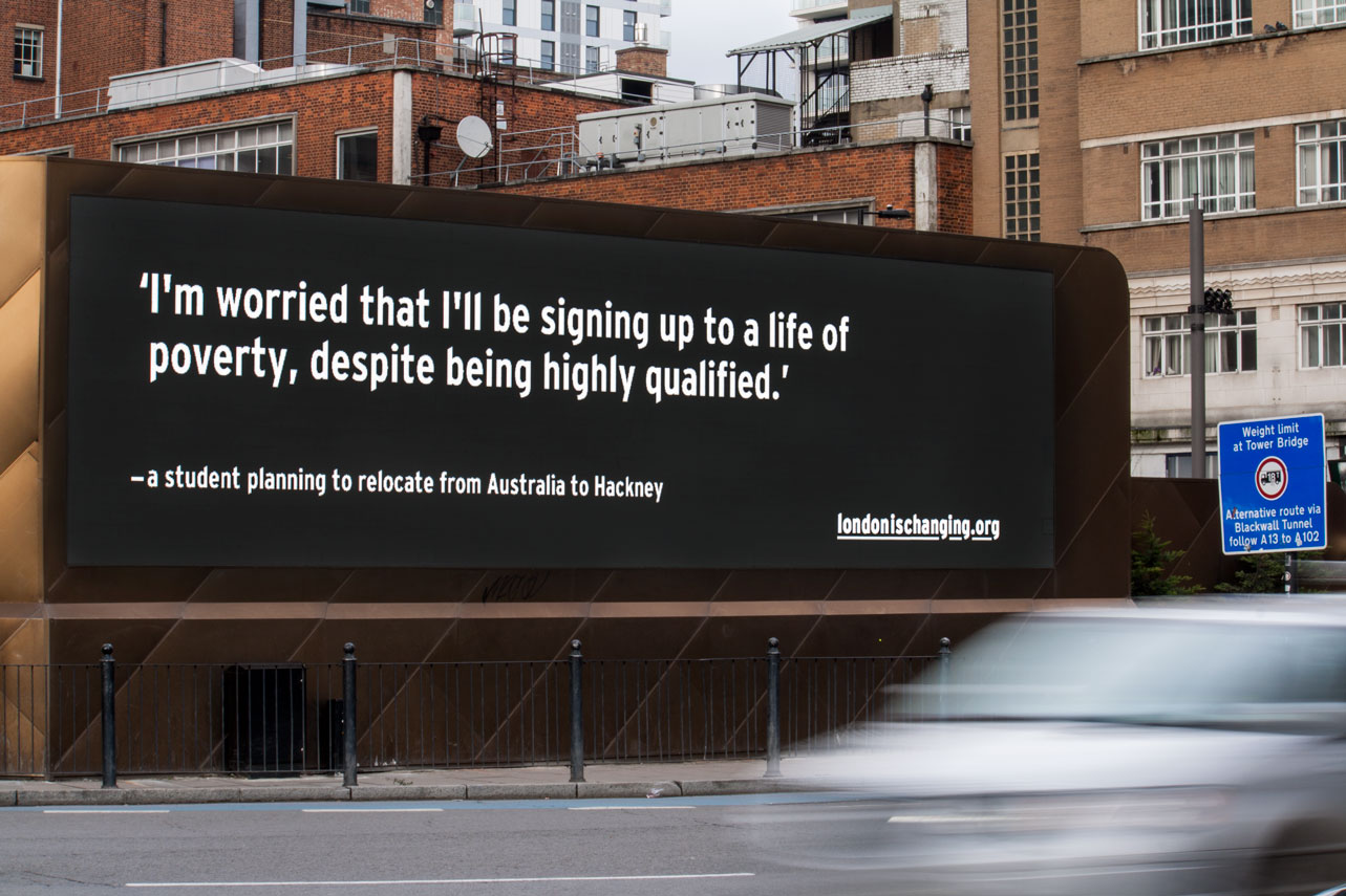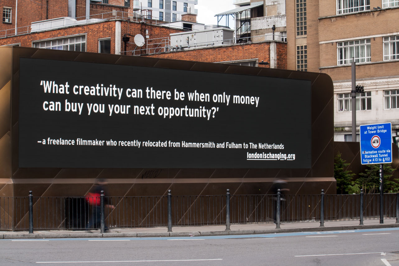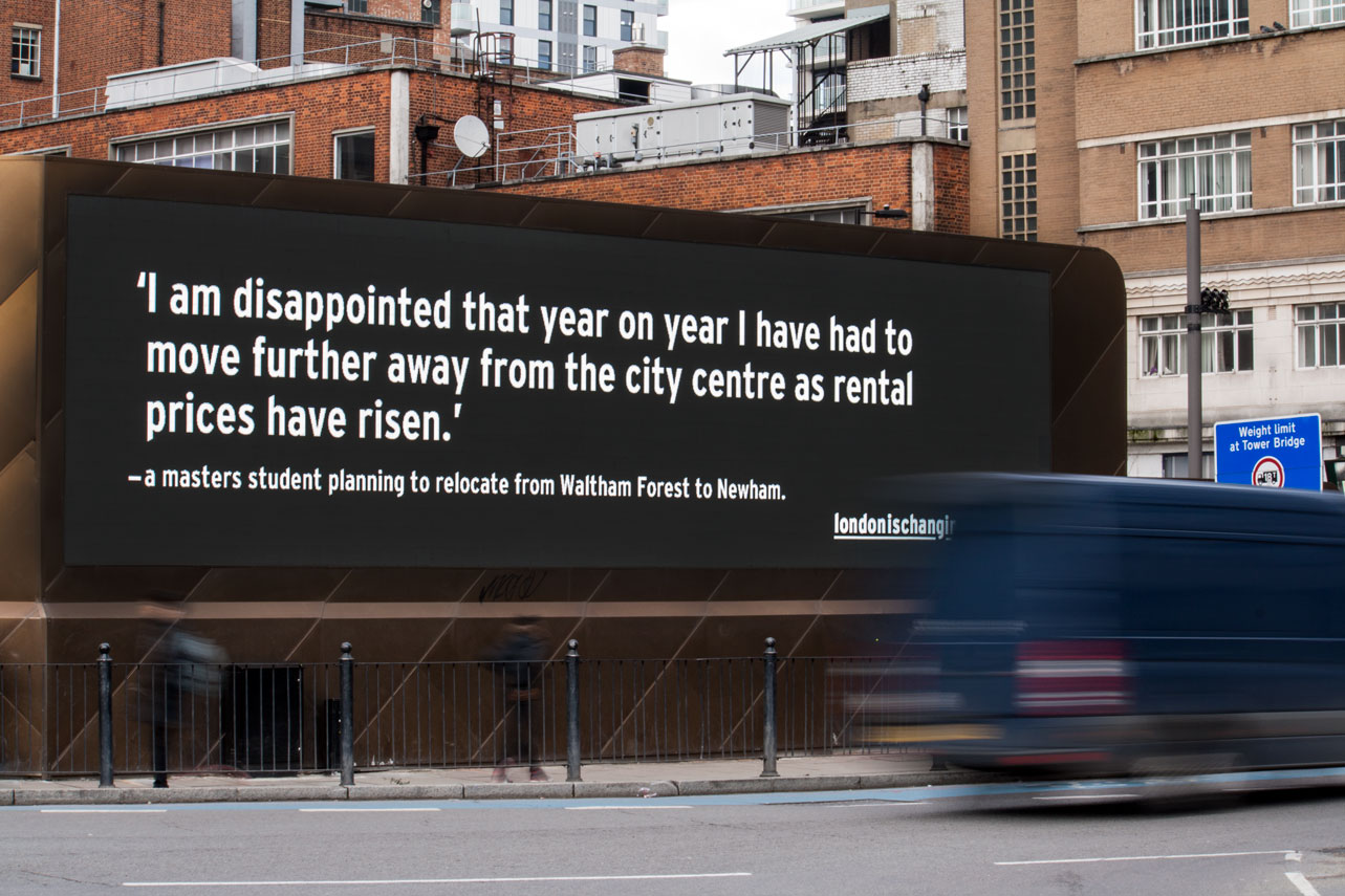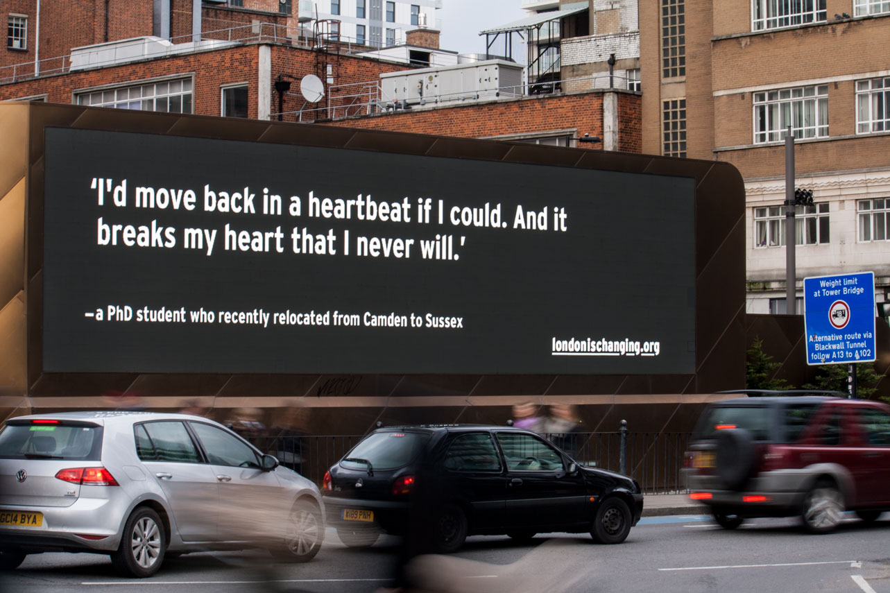 This is the archived site for London is Changing, a project that ran during 2015 which facilitated discussion about the impact of economic and policy changes on the culture and diversity of London. Via a web form, participants were asked a series of questions intended to draw out a personal stories and circumstances that would place large scale demographic into more specific context. An edited selection of responses was displayed on digital billboards in Central London during late February and early March 2015. Over 5,000 participants who recently (within the previous 12 months) or were planning (within the subsequent 12 months) a move to, from, or around Greater London participated. The entire set is available for as a csv file under a CC0 'No Rights Reserved' basis. Please note that the web form was structured so that questions could be answered without any identifiable personal details and we have no way of contacting or following up with participants.